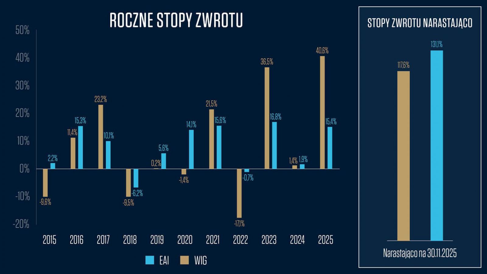 EQUES Aktywnego Inwestowania FIZ nie ma benchmarku, ale jego wyniki, ze względu na możliwość zaangażowania w akcje nawet do 100% portfela, są zwykle porównywane do indeksu WIG. Jakie stopy zwrotu przynosi strategia zmiennej alokacji, skrupulatna selekcja spółek i skuteczny zarządzający? Od zmiany strategii (30.09.2014) stopa zwrotu Funduszu wynosi (+122,8%), vs. WIG (+103,8%). Oznacza to, że przez 11 lat działalności Fundusz rósł średniorocznie o (+7,4%), podczas gdy indeks szerokiego rynku o (+6,6%). Warto podkreślić, że faktyczne średnie zaangażowanie Funduszu w akcje i surowce wyniosło w całym okresie jego działalności tylko 56,1%, bo to były trudne lata – umiarkowana stopa zwrotu z indeksu także to potwierdza.
