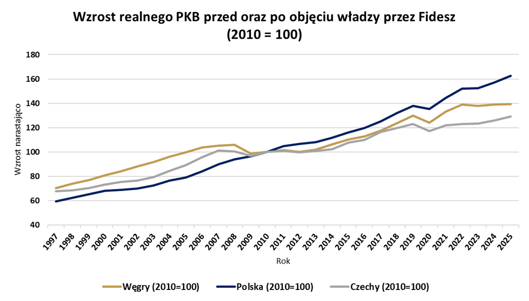 W ujęciu długoterminowym wynik wyborów można interpretować jako potencjalny punkt zwrotny dla ścieżki rozwoju gospodarczego Węgier. Jak widać na poniższym wykresie, od 2010 roku dynamika realnego PKB zaczęła odbiegać od Polski i Czech, co odzwierciedla narastające ograniczenia strukturalne oraz podwyższoną premię za ryzyko. Uzyskanie silnego mandatu politycznego przez nowy rząd zwiększa prawdopodobieństwo odwrócenia tych trendów, jednak skala i tempo poprawy będą zależały od skuteczności wdrażanych reform. Z perspektywy rynków oznacza to potencjał do dalszego zawężania dyskonta z jakim handlowane są węgierskie aktywa wobec regionu, przy jednoczesnym utrzymaniu podwyższonej niepewności w okresie przejściowym.