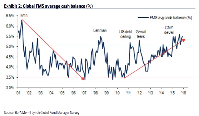 Wykres 1: Udział gotówki w aktywach globalnych funduszy. Źródło: BofA Merrill Lynch GFMS.