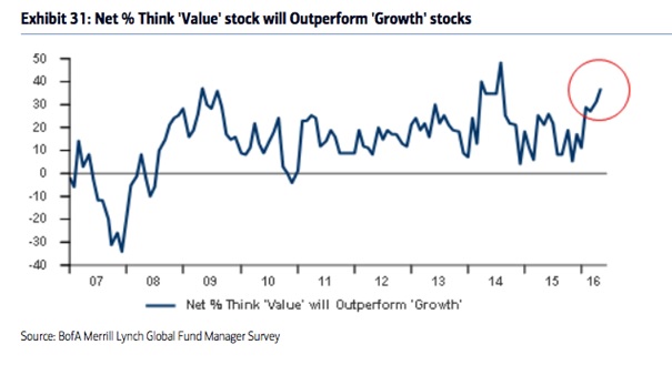 Wykres 2: Udział zarządzających przewidujących, że lepsze efekty przyniesie inwestowanie w wartość niż wzrost (spółki wzrostowe będą zachowywać się słabiej). Źródło: BofA Merrill Lynch GFMS.
