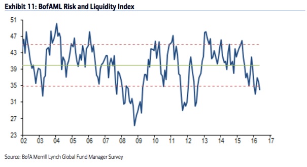 Wykres 3: Indeks opisujący aktualną „skłonność do ryzyka” wśród inwestorów. Źródło: BofA Merrill Lynch GFMS.