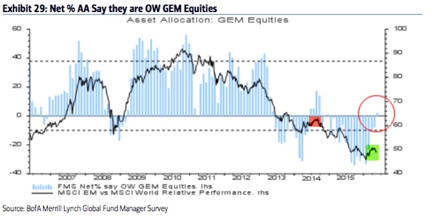 Wykres 4: Udział zarządzających deklarujących przeważenie na rynkach wschodzących na tle relatywnego zachowania MSCI EM vs MSCI World. Źródło: BofA Merrill Lynch GFMS.