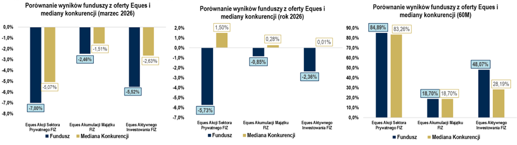 Poniżej przedstawiamy wyniki naszych funduszy za marzec 2026 r. Ze względu na przyjętą alternatywną strategię inwestycyjną wszystkie trzy fundusze EQUES Akumulacji Majątku FIZ (-2,46%), EQUES Aktywnego Inwestowania FIZ (-5,52%) oraz EQUES Akcji Sektora Prywatnego FIZ (-7,00%) osiągnęły stopy zwrotu niższe od konkurencyjnych rozwiązań. Wpływ na to miała przede wszystkim niższa alokacja w sektor paliwowy względem szerokiego rynku oraz ekspozycja na spółki technologiczne i złoto. W marcu indeks WIG-PALIWA wzrósł o 17%, a większość spółek wchodzących w skład indeksu to podmioty z udziałem Skarbu Państwa. Dodatkowo przypominamy, że zgodnie ze statutem fundusz EQUES Akcji Sektora Prywatnego FIZ nie może inwestować w spółki z udziałem Skarbu Państwa. Mimo to w ujęciu długoterminowym (60 miesięcy) każdy z powyższych funduszy wypracował stopę zwrotu przewyższającą lub równą medianie swojej grupy porównawczej.